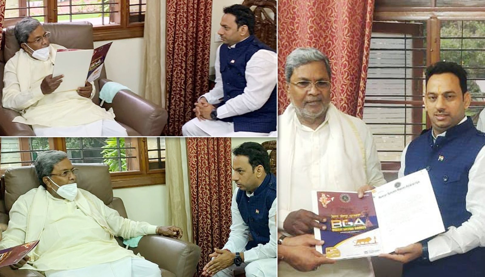भारत गौरव अवार्ड फाउंडेशन के महासचिव डॉ. सन्देश यादव ने बैंगलोर प्रवास के समय कर्नाटक के मुख्यमंत्री श्री सिद्दारमैया जी के साथ बैठक की । इस बैठक में फाउंडेशन के महासचिव डॉ. सन्देश यादव ने फाउंडेशन की सामाजिक गतिविधियों और आगामी योजनाओं से सिद्दारमैया जी को अवगत कराया जिस पर उन्होंने फाउंडेशन द्वारा सामाजिक उत्थान व भारत की प्रतिभाओं को प्रोत्साहित करने की दिशा में किये जा रहे कार्यों की सराहना की और भविष्य की योजनाओं के प्रति अपने पूर्ण सहयोग का आश्वासन दिया । इस असवर पर फाउंडेशन के महासचिव भारत गौरव पुरस्कार और इसकी उपयोगिता बताई जिसके लिए श्री सिद्दारमैया जी ने फाउंडेशन को अनंत शुभकामनायें प्रदान की ।