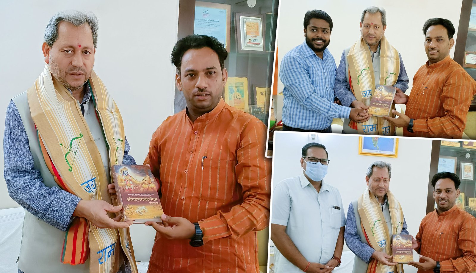 भारत गौरव अवार्ड फाउंडेशन के प्रतिनिधिमंडल ने उत्तराखंड के पूर्व मुख्यमंत्री व वर्तमान सांसद श्री तीरथ सिंह रावत जी से उनके कार्यालय में भेंट की । इस बैठक में फाउंडेशन के महासचिव डॉ. सन्देश यादव ने फाउंडेशन की सामाजिक गतिविधियों और आगामी योजनों से सांसद महोदय को अवगत कराया । श्री रावत ने फाउंडेशन द्वारा सामाजिक उत्थान व भारत की प्रतिभाओं को प्रोत्साहित करने की दिशा में किये जा रहे कार्यों की सराहना की और भविष्य की योजनाओं के प्रति अपने पूर्ण सहयोग का आश्वासन दिया । इस असवर पर फाउंडेशन के महासचिव डॉ. सन्देश यादव ने ‘घर घर गीता घर घर श्याम’ अभियान के अंतर्गत श्री तीरथ सिंह रावत जी को भगवद्गीता भेंट की । श्री तीरथ सिंह रावत ने भगवद्गीता के प्रति श्रद्धा रखते हुए फाउंडेशन का आभार व्यक्त किया ।