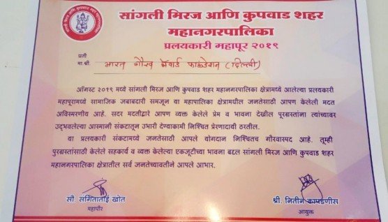 The Bharat Gaurav Award Foundation has sent a medical team, equipped with medicines and life saving materials, to the flood affected Kolhapur, Sangli and Satara areas of Maharashtra. There has been unprecedented rainfall in these areas in just one day which has flooded residential areas and caused havoc, rendering a large population shelterless. The Sangli Municipal Corporation has issued a letter of appreciation for the noble efforts of the foundation, signed by Mayor Sangitatai Khot and Commissioner Nitin Kapadnis. Foundation General Secretary Mr Sandesh Yadav has assured that more material will be sent to the affected areas and the Foundation will do all that it can to provide relief to victims of floods.